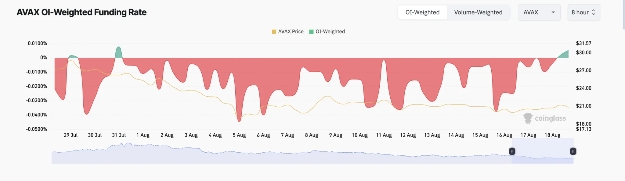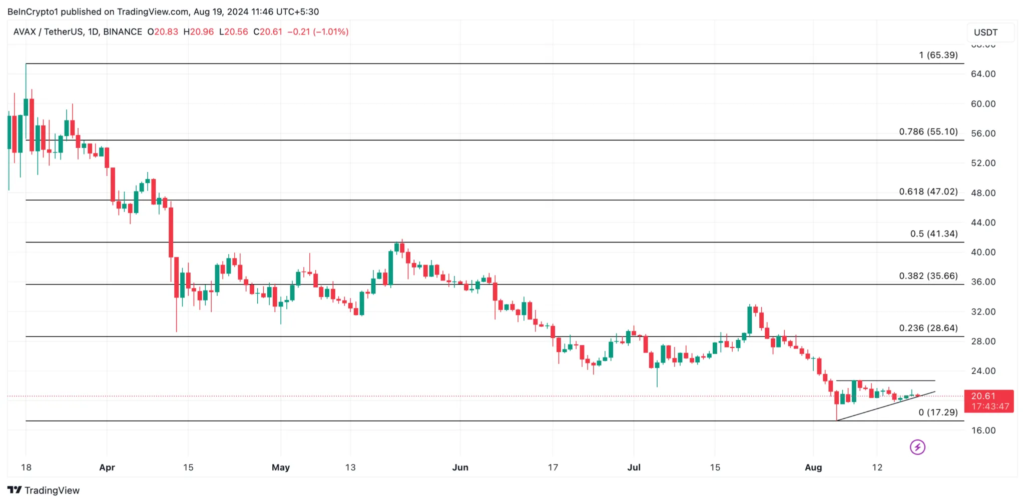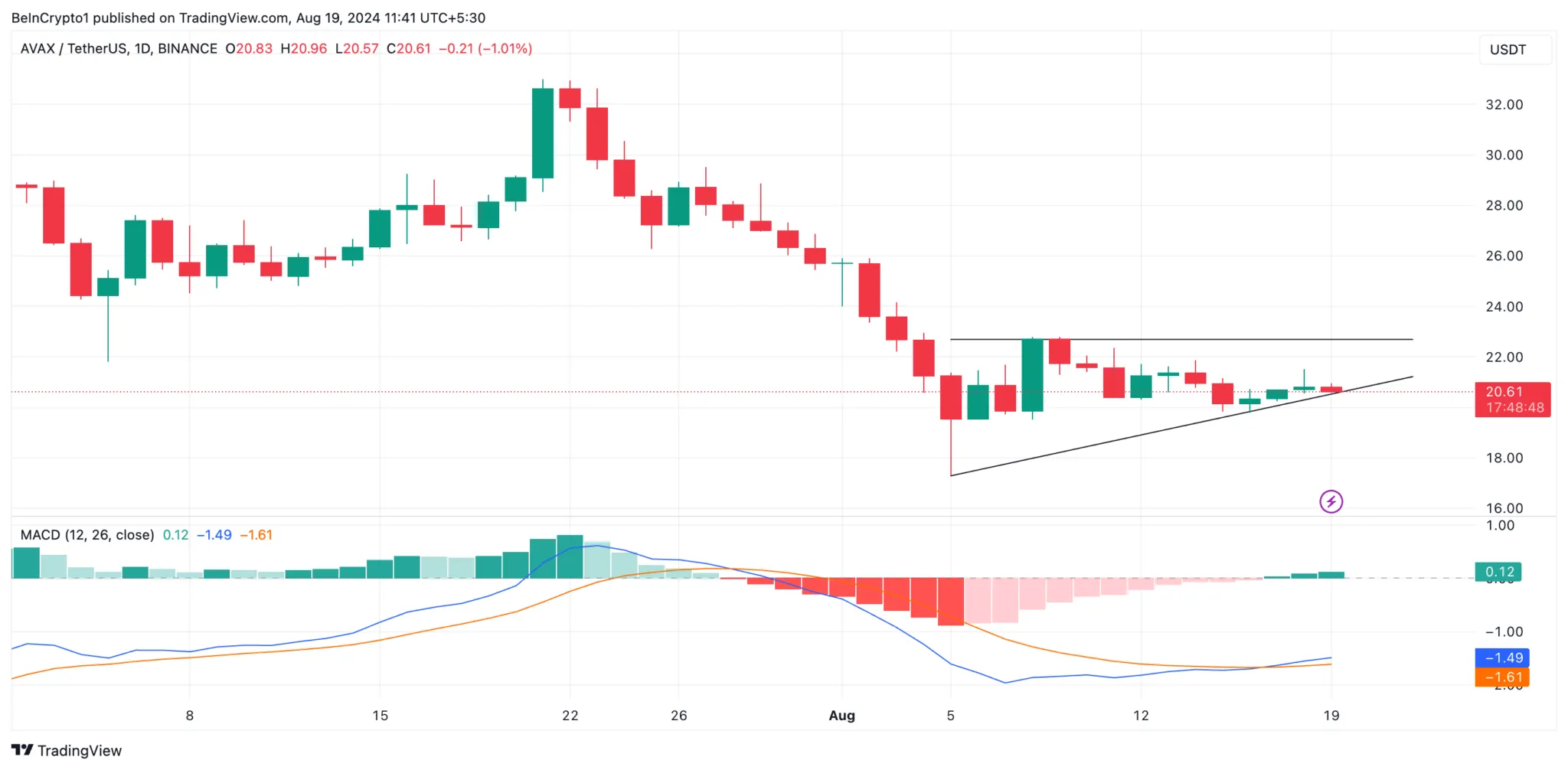 Se a pressão de venda se intensificar, a AVAX pode cair abaixo da linha de suporte de seu triângulo de alta, potencialmente testando novamente a baixa do dia 5 de agosto de US$ 19,54.