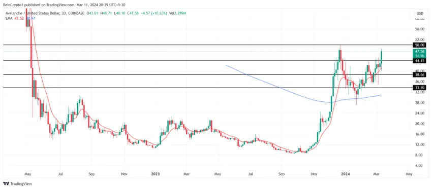 No entanto, a altcoin poderá sofrer alguma correção se falhar em passar por esse nível novamente. Isso faria com que a Avalanche caísse para US$ 44.
