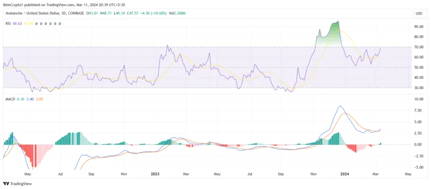 Os investidores e as condições de mercado apoiam um cenário onde a AVAX ultrapassa a marca de US$ 50. O Índice de Força Relativa (RSI) está atualmente na zona de alta, abaixo do limite de sobrecompra, o que indica um resultado positivo.