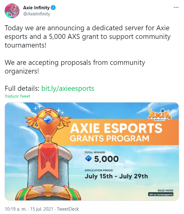 “Hoje anunciamos um servidor dedicado para o Axie eSports e uma adesão de 5.000 AXS para apoiar torneios da comunidade! Aceitamos propostas de organizadores da comunidade!”