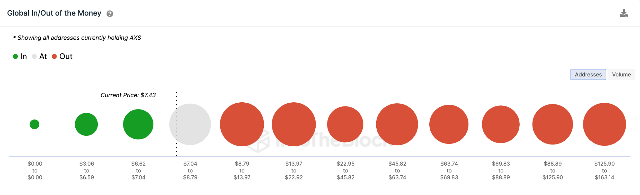 De acordo com os dados do Global In/Out of Money (GIOM) do IntoTheBlock, é provável que o AXS suba acima de US$ 11 novamente pela primeira vez desde janeiro de 2023.