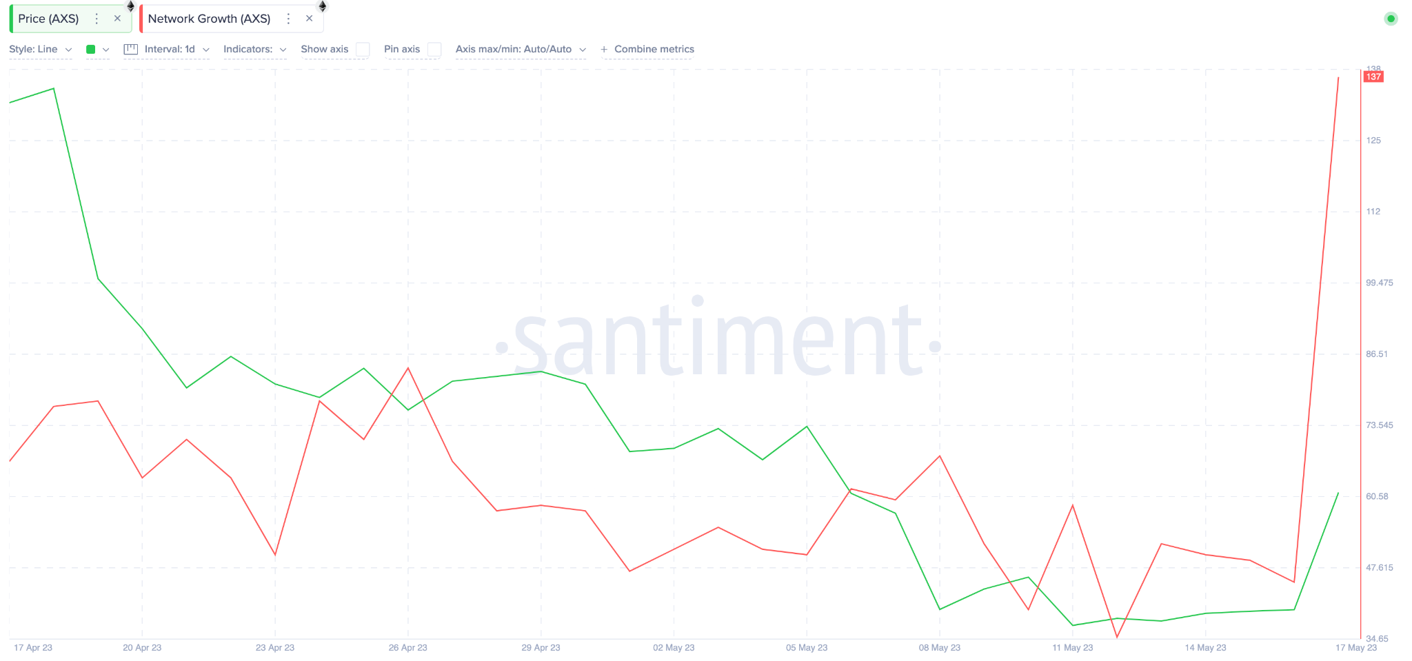E com o sentimento social ainda significativamente mais baixo do que a recente alta eufórica de 0,33 registrada em 20 de abril, isso sugere que o preço do AXS ainda pode subir consideravelmente.