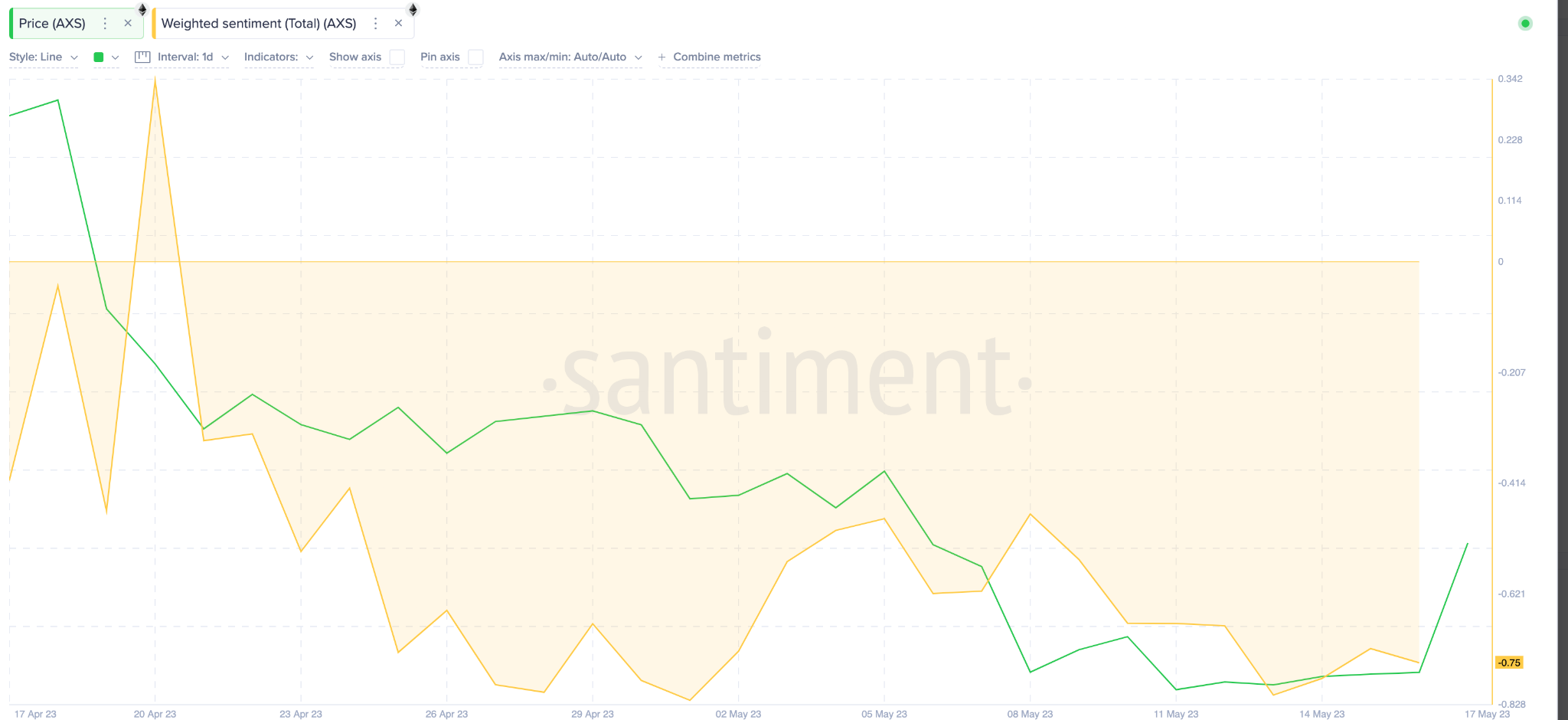 A métrica de sentimento ponderado da Santiment, que compara a proporção de menções positivas de um ativo com as negativas, ainda permanece profundamente na zona negativa. O gráfico abaixo mostra que o sentimento ponderado do AXS ainda está em torno de -0,75.