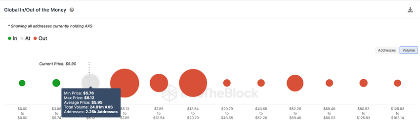 De acordo com os dados In/Out of Money Around Price (IOMAP) da IntoTheBlock, o crescente momento de baixa provavelmente empurrará o AXS para US$ 5. Conforme mostrado abaixo, 2.260 endereços compraram 24,81 tokens ao preço mínimo de US$ 5,76.