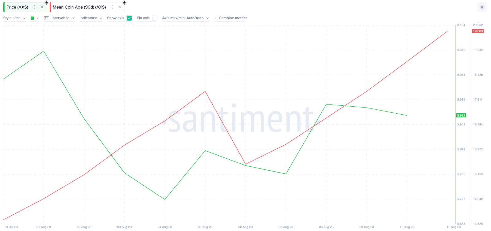 No entanto, os dados on-chain indicam que a tendência mudou esta semana. O gráfico da Santiment abaixo mostra que o Mean Coin Age começou a subir novamente. Após uma queda perceptível na semana passada, o indicador aumentou 28% entre 6 e 11 de agosto.