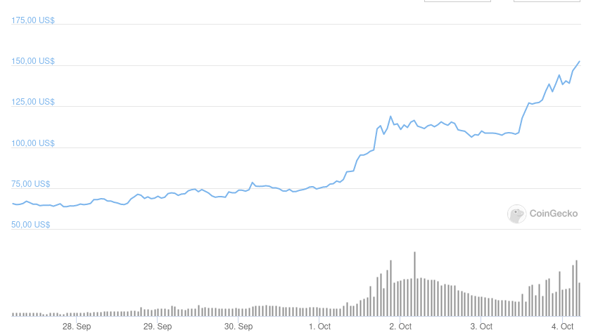 O AXS registrou uma nova máxima histórica após ultrapassar US$ 153, um aumento de 140% em sete dias, segundo dados do CoinGecko.