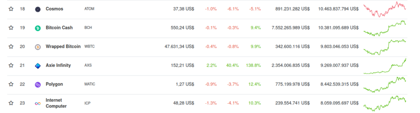 A capitalização total de mercado do Axie Infinity explodiu na mesma proporção, atingindo US$ 9,1 bilhões, o que o impulsionou para a 21ª posição no ranking do mercado de criptomoedas.