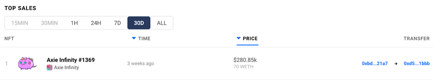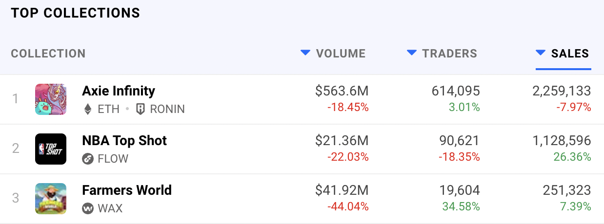 Segundo a DappRadar NFT Rankings, o game jogue-e-ganhe (play-to-earn) continua no topo da lista de NFTs colecionáveis após o registro de 2.259.133 em vendas individuais nos últimos 30 dias.