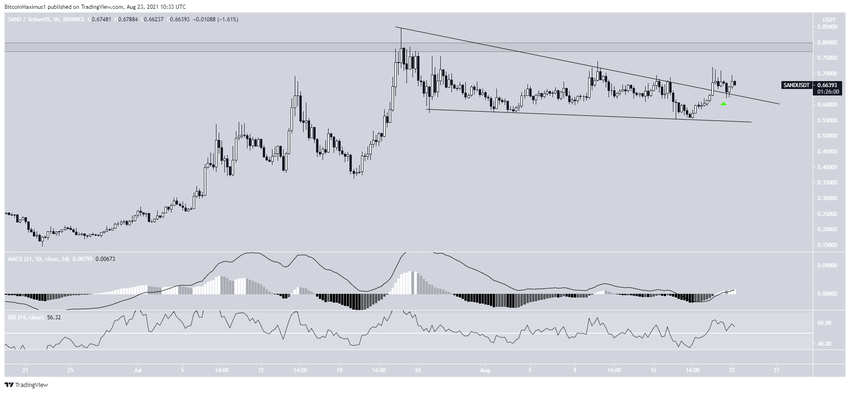 O Sandbox (SAND) é negociado entre seus níveis de suporte e resistência em US$ 0,575 e US$ 0,78, respectivamente. Já o Axie Infinity (AXS) atingiu uma nova máxima histórica no dia 21 de agosto, mas agora é negociado dentro de um padrão de baixa.