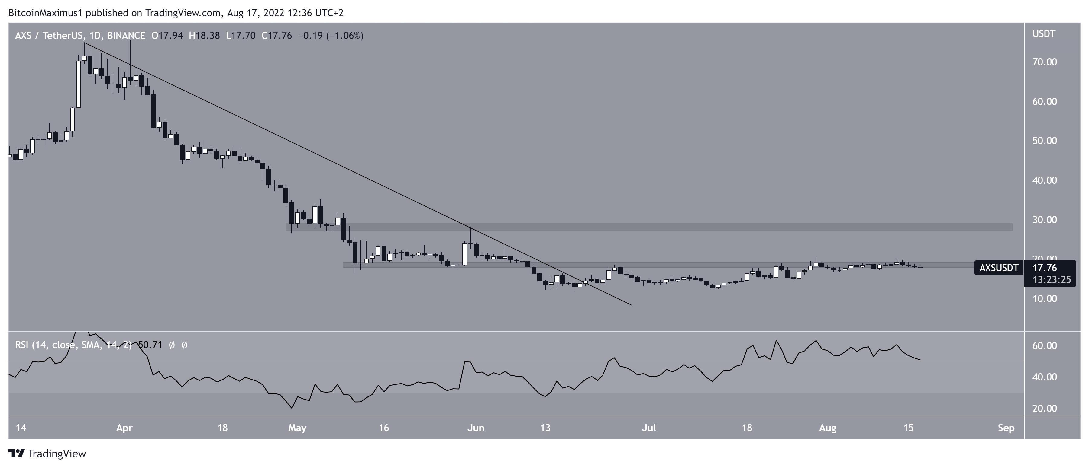 O AXS está em tendência de alta desde que atingiu a mínima de US$ 11,85 em 18 de junho. Embora seu preço tenha rompido uma linha de tendência de baixa logo depois, ele não conseguiu iniciar um movimento significativo de alta.