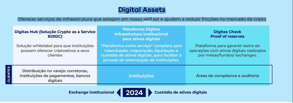 Infraestrutura institucional para ativos digitais: oferta de toda a infraestrutura para o mercado de ativos digitais, o que inclui: processo de tokenização, com a geração dos smart contracts; custódia; plataforma de negociação; facilitação de liquidação; e gestão de risco.