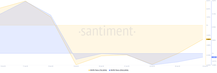 O índice Market Value to Realized Value (MVRV) da Cardano — um indicador chave de se um ativo está supervalorizado ou subvalorizado — sinaliza que a moeda pode estar subvalorizada no preço de mercado atual. No momento desta escrita, os índices MVRV de sete e 30 dias da moeda são -2,88% e -0,98%, respectivamente.