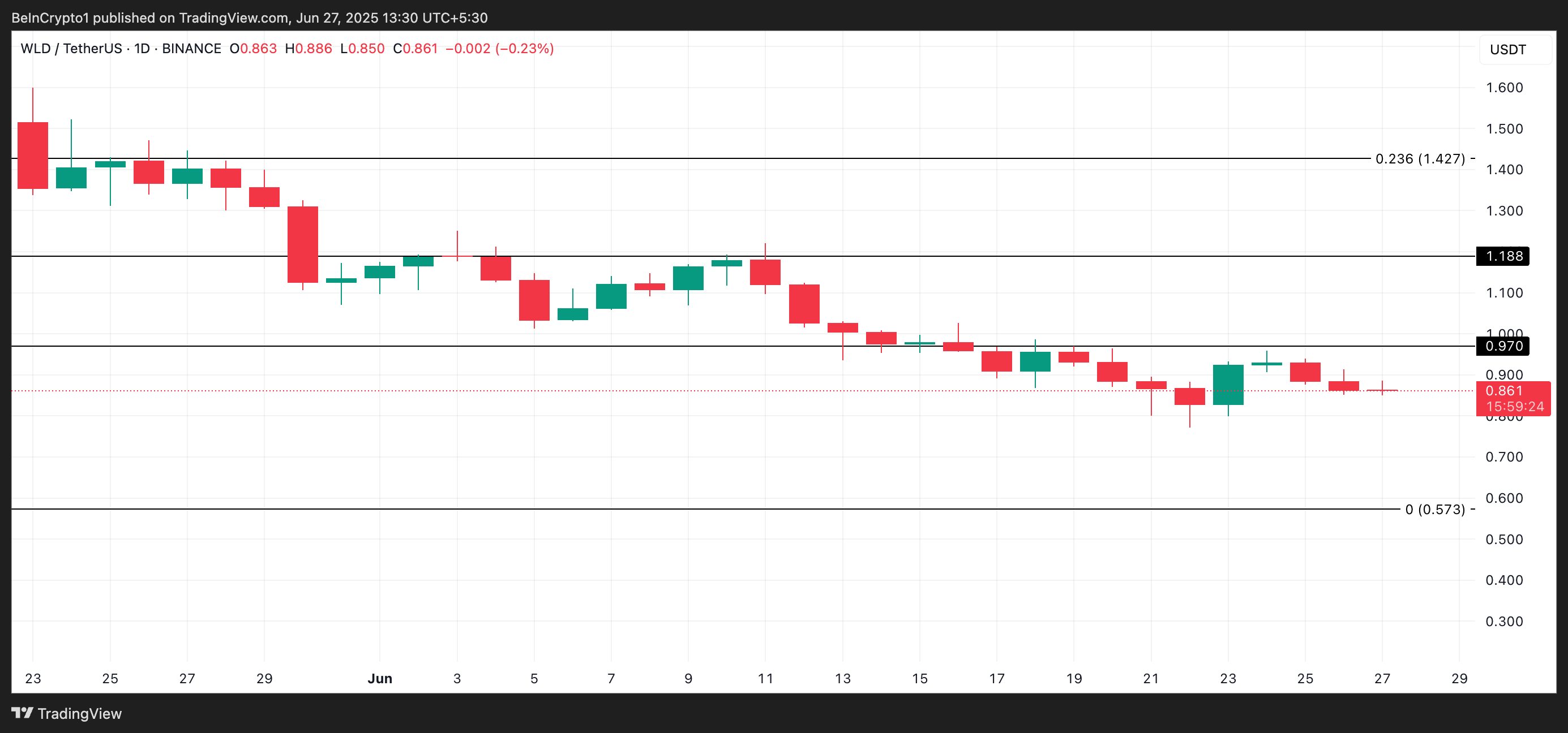 No entanto, se o sentimento se tornar pessimista e as baleias venderem para obter lucro, a WLD pode perder parte de seu valor e cair para US$ 0,57.