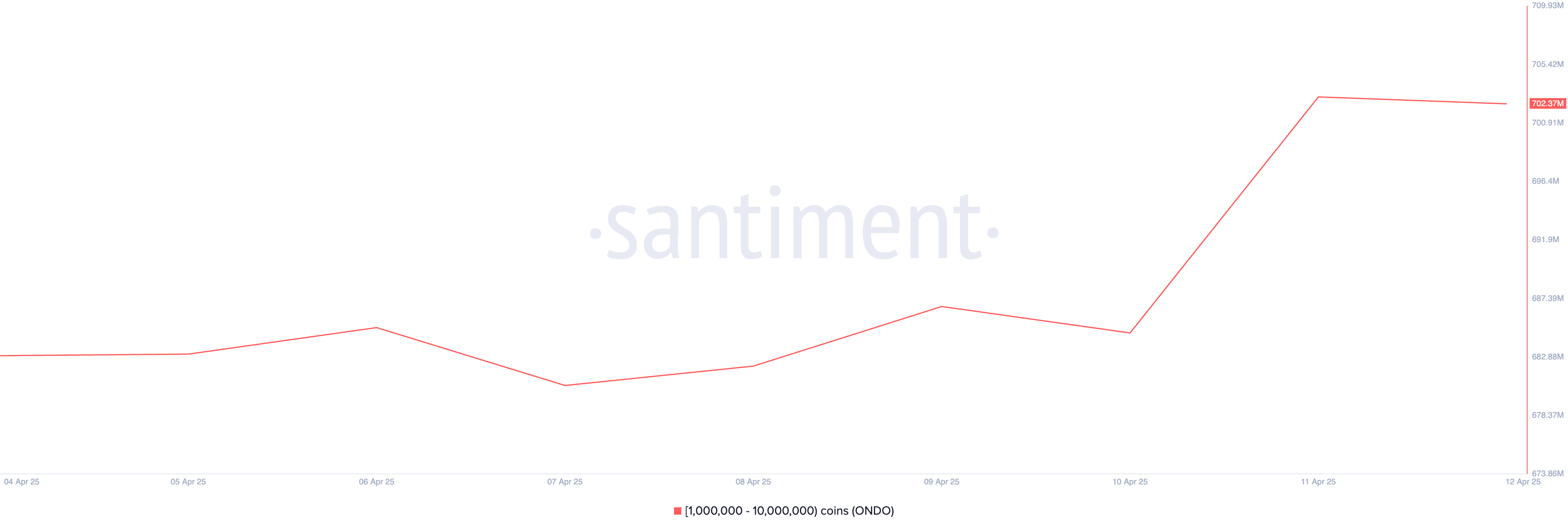 O token baseado em ativos do mundo real (RWA) ONDO também está na lista das baleias de cripto desta semana. Segundo a Santiment, nos últimos sete dias, baleias que possuem entre 1 milhão e 10 milhões de ONDO compraram 19,41 milhões, avaliados em aproximadamente US$ 17 milhões.