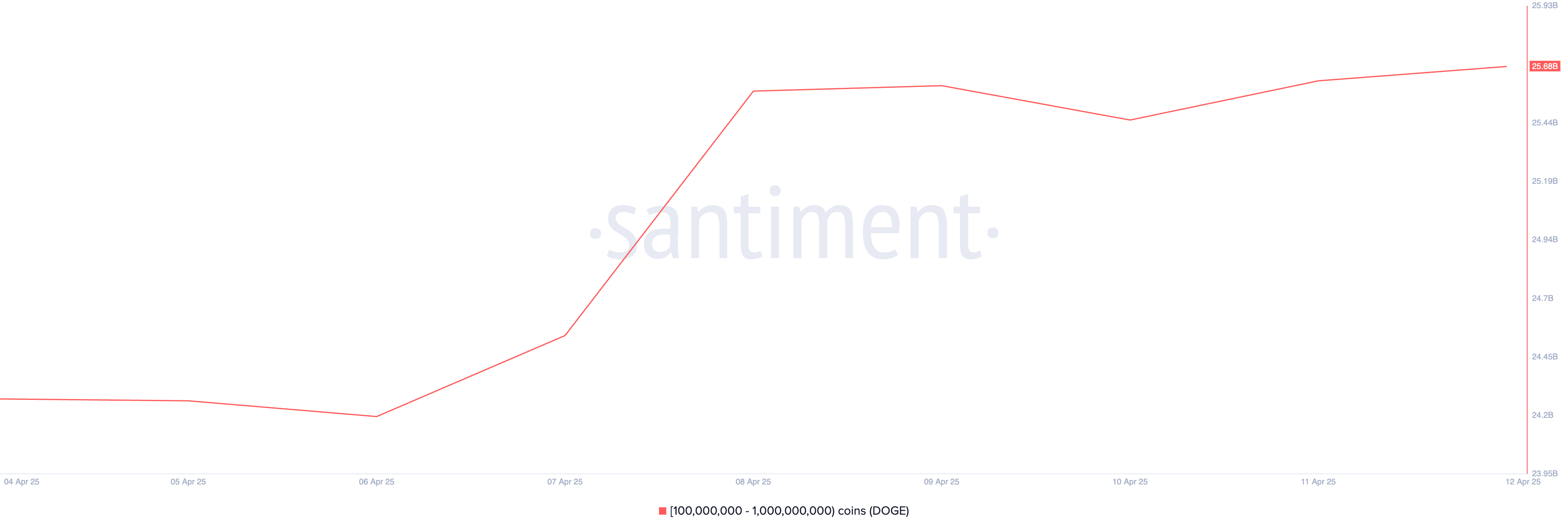 De acordo com dados da Santiment, esses detentores de DOGE acumularam 1,41 bilhão de moedas, avaliadas em mais de US$ 220 milhões durante o período de análise. No momento da publicação, suas participações totais aumentaram para 25,68 bilhões de DOGE, marcando o nível mais alto desde dezembro do ano passado.