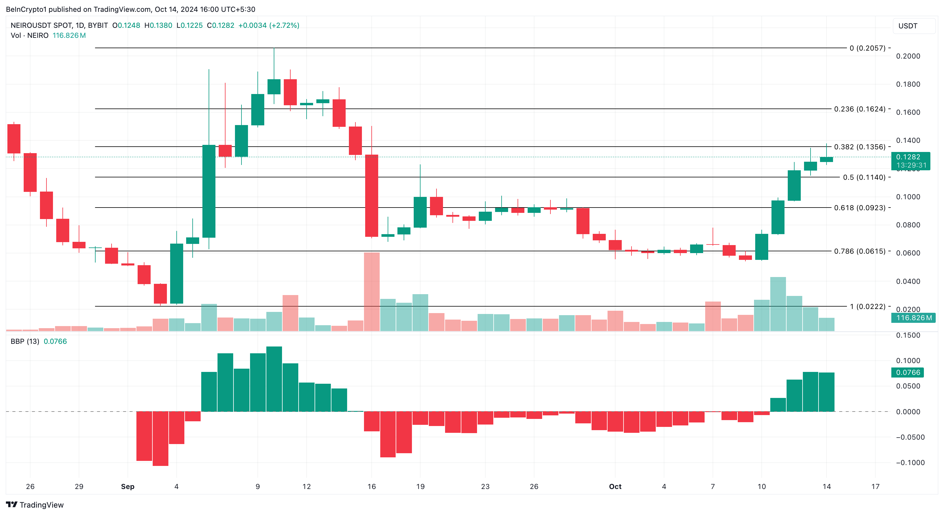 Por outro lado, quando o BBP cai e a barra do histograma é vermelha, os vendedores (ursos) são dominantes. Como o gráfico diário mostra o primeiro caso, o preço do NEIRO pode subir para US$ 0,16.