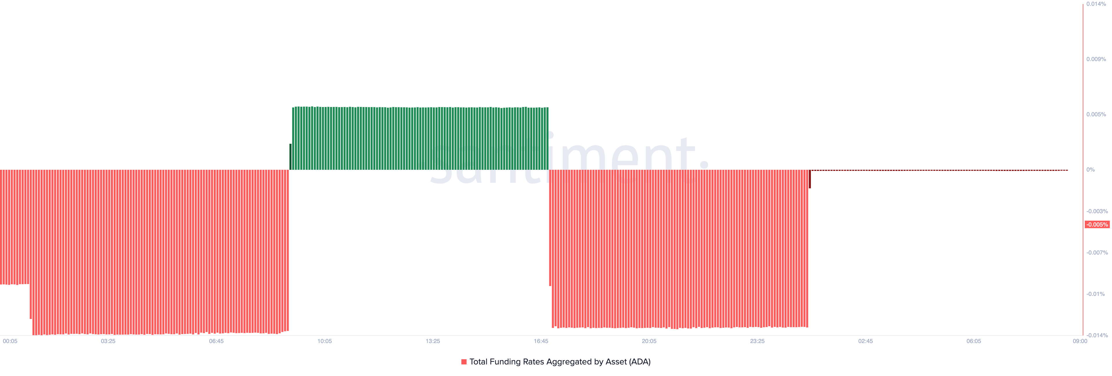 Além disso, essa queda na atividade das baleias de ADA ocorre em meio à crescente demanda por posições vendidas no mercado futuro da moeda. Isso é refletido pela taxa de financiamento negativa da moeda de -0,005%, o que sugere que os traders estão apostando cada vez mais contra o ativo.