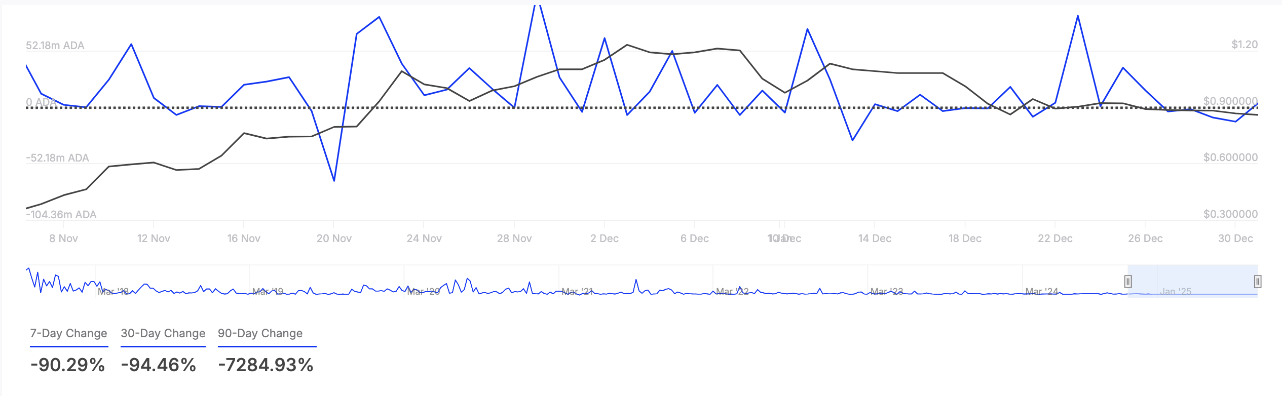 A queda no fluxo líquido dos grandes detentores sinaliza uma confiança enfraquecida entre os grandes investidores de ADA, o que pode levar a menor liquidez e maior volatilidade de preços. Se essa tendência continuar, a moeda pode enfrentar mais pressão de baixa à medida que o impulso de compra de investidores chave diminui ainda mais.