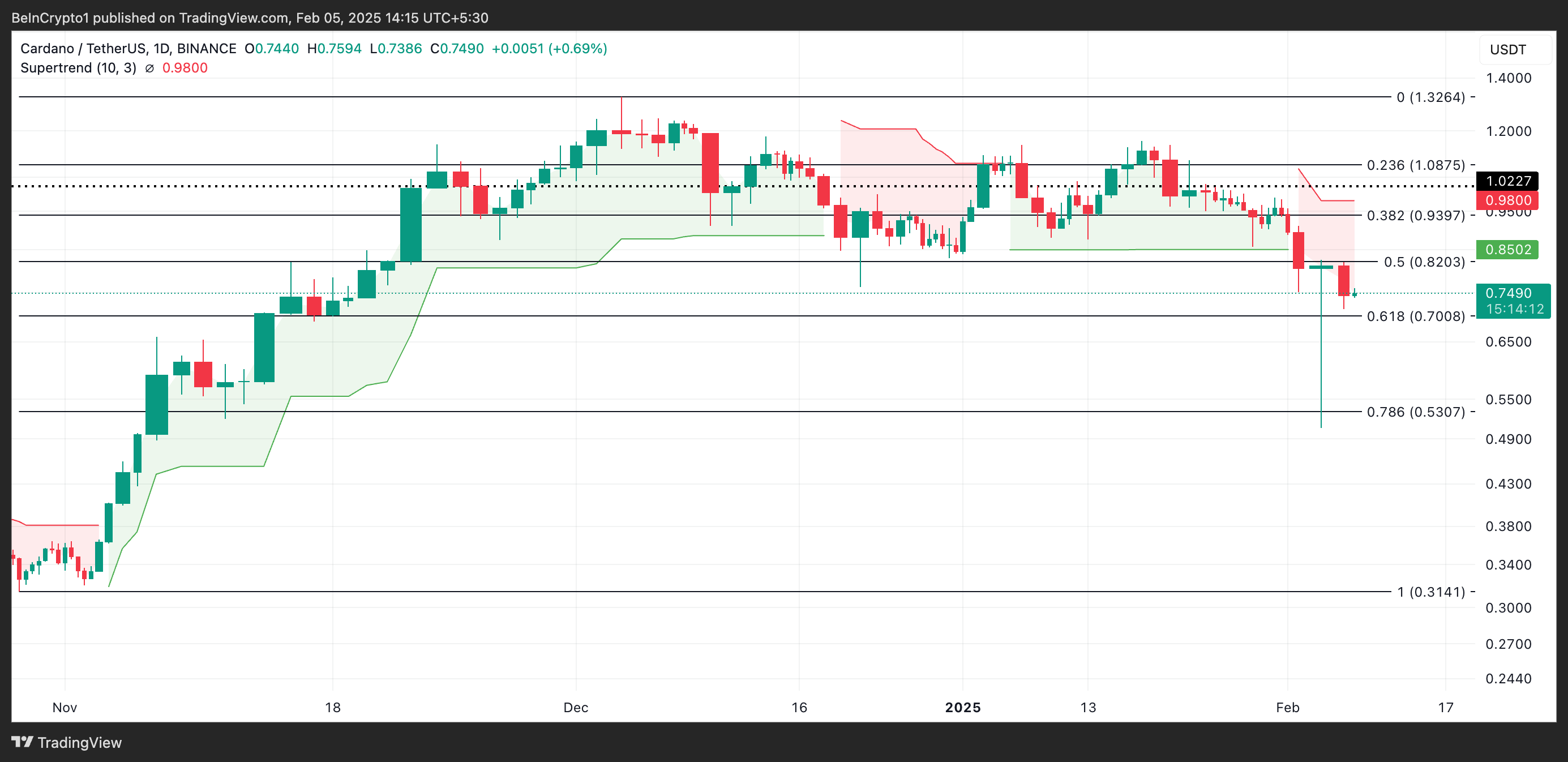 Assim como com ADA, a pressão de venda domina o mercado quando o preço de um ativo é negociado abaixo da linha vermelha do indicador Super Trend. Se as vendas persistirem, o preço de ADA continuará seu declínio e cairá para US$ 0,70.