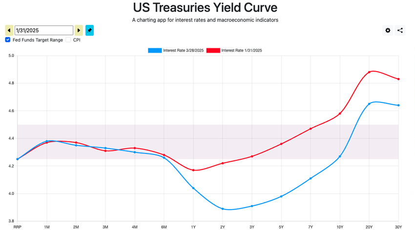 Em meio a altos níveis de incerteza macroeconômica, investidores têm direcionado fundos para os títulos do tesouro dos EUA como um refúgio. Fonte: ustreasuryyieldcurve.com