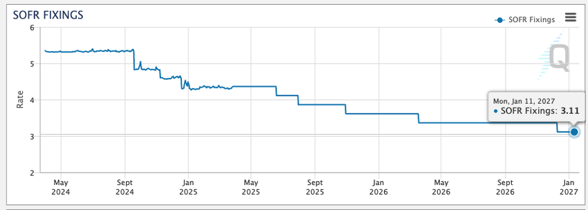 As expectativas de taxa de juros implícitas nos futuros SOFR mostram que, mesmo que haja um corte total de 75bps em 2025, o nível de juros em 2027 pode ainda estar acima de 3%. Fonte: CME Group