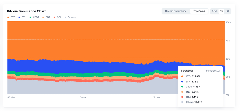 Altcoins e ações de memes podem ser consideradas as “Cartas Mais Baixas” com os pontos mais baixos. A situação que enfrentam é obviamente pior: altas taxas de financiamento suprimem o sentimento especulativo dos investidores, e no caso de aversão ao risco, ativos na “faixa de risco extra-alto” são frequentemente vendidos primeiro e podem ser comprados de volta por último. Embora novos tópicos e pontos quentes continuem a surgir no mercado de altcoins, o fluxo de fundos dos investidores não mente: no último ano, a participação de mercado do BTC aumentou de 52% para 61,2%, enquanto a participação de mercado das altcoins caiu abaixo de 20%.