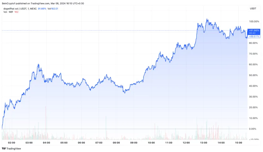 A memecoin Dogwifhat (WIF) segue em forte tendência de alta, subindo mais de 100% em apenas 12 horas.