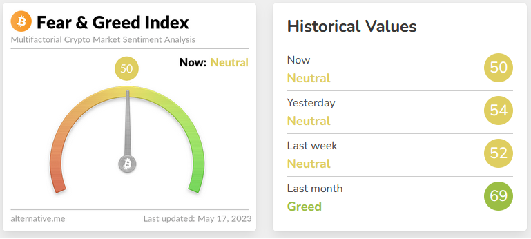 Atualmente, o indicador está na linha de 50, o que mostra um sentimento neutro em relação a criptomoeda.