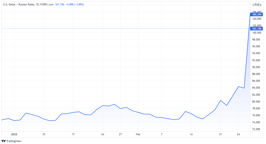 Enquanto isso, o rublo russo também sofreu uma queda vertiginosa e agora vale menos de um centavo. Há temores de que isso possa levar à hiperinflação e, em qualquer caso, uma forte tendência de inflação é quase certa nos próximos meses.