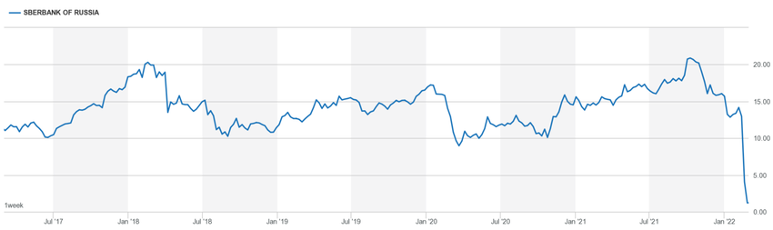 SponsoredAs ações do maior banco russo, o Sberbank, caíram impressionantes 74%, no que é a maior queda que já experimentou. O BCE também observa que o banco está próximo da falência ou chegará à falência em breve.
