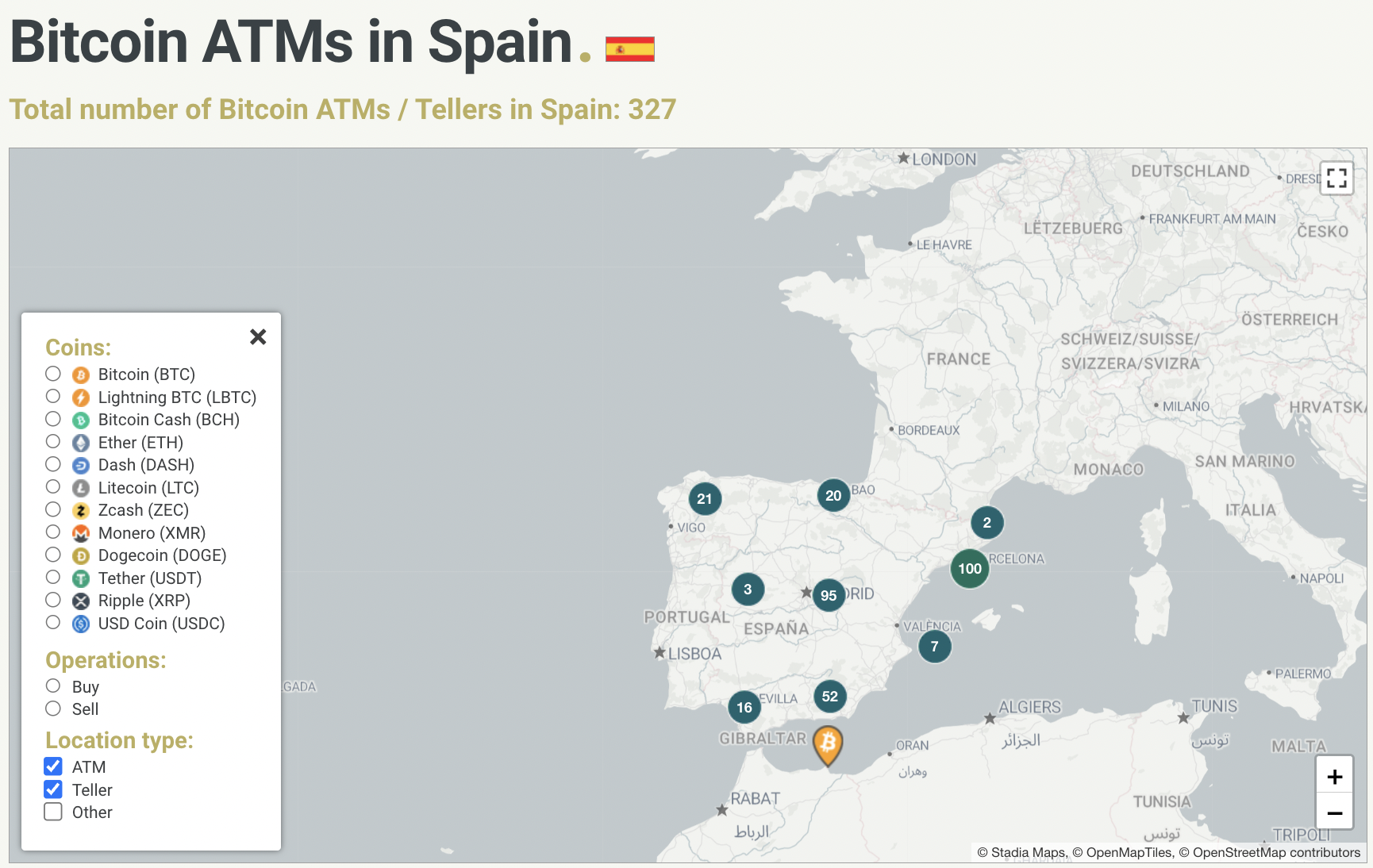 A maioria aceita Bitcoin, Bitcoin Cash, Ethereum, DASH, Litecoin, Monero, Dogecoin, USDT, XRP e USDC. A maioria está localizada em Madri (68), Barcelona (73), Valência (36), La Palma (22), Sevilha (40) e La Coruña (6).