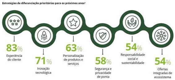 Os bancos estão empenhados em uma agenda de evolução contínua. Eles priorizam principalmente temas como Experiência do Cliente (83%), Inovações Tecnológicas (71%), Personalização de Produtos e Serviços (63%), Segurança e Privacidade (58%), Responsabilidade Social e Sustentabilidade (54%) e Ofertas Integradas de Ecossistema (54%).