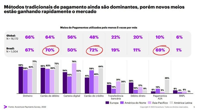 No Brasil, as carteiras digitais correspondem a 50%, contra 72% do cartão de crédito. O país está à frente quando o assunto é a adoção de novos meios de pagamento, principalmente com o uso do PIX. Só perdemos para Índia, o maior mercado do mundo quando o assunto é pagamento instantâneo.