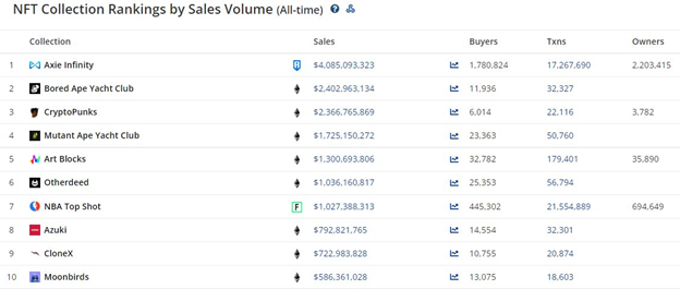 Por muito tempo, o CryptoPunks ficou atrás apenas do Axie Infinity nos rankings de vendas. O Bored Ape Yacht Club agora usurpou o segundo lugar depois de atingir US$ 2,4 bilhões em vendas de todos os tempos, um pouco à frente das vendas de US$ 2,36 bilhões da CryptoPunks.