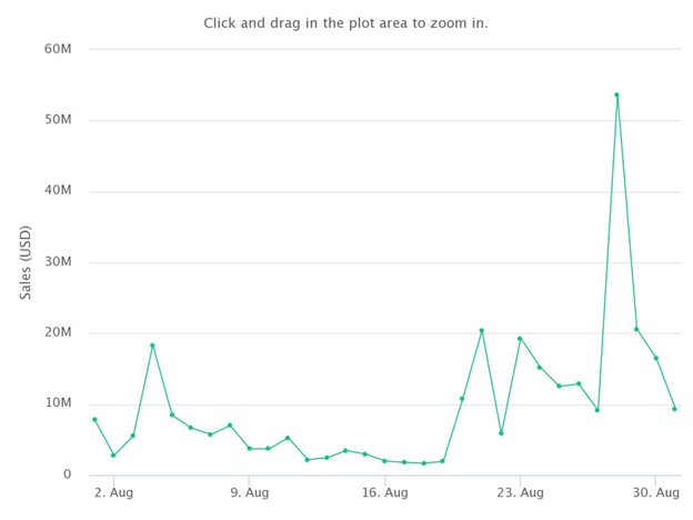 No período, o BAYC gerou aproximadamente US$ 299 milhões. Apesar de uma redução de 1.880 compradores únicos e 3.506 transações totais, o valor médio de venda subiu para US$ 85.288. Este foi um aumento de 551% no preço médio de venda em relação aos US$ 13.091 de julho.