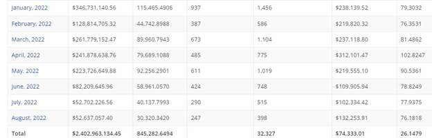 Desde janeiro de 2022, as vendas mensais permaneceram abaixo de US$ 100 milhões. Nos últimos quatro meses (maio a agosto), os CryptoPunks viram menos de US$ 50 milhões em volume.