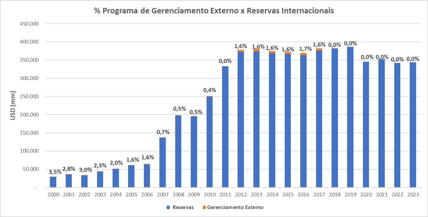 O primeiro foi entre 2000 e 2010, com um montante de US$ 1,2 bilhão. O segundo foi entre 2012 e 2017, com volume total alocado de US$ 6 bilhões. Não temos desde 2017 recursos alocados em programas de gerenciamento externo. O gráfico abaixo destaca o efetivo percentual de reservas internacionais em programas de gerenciamento externo a cada ano.”