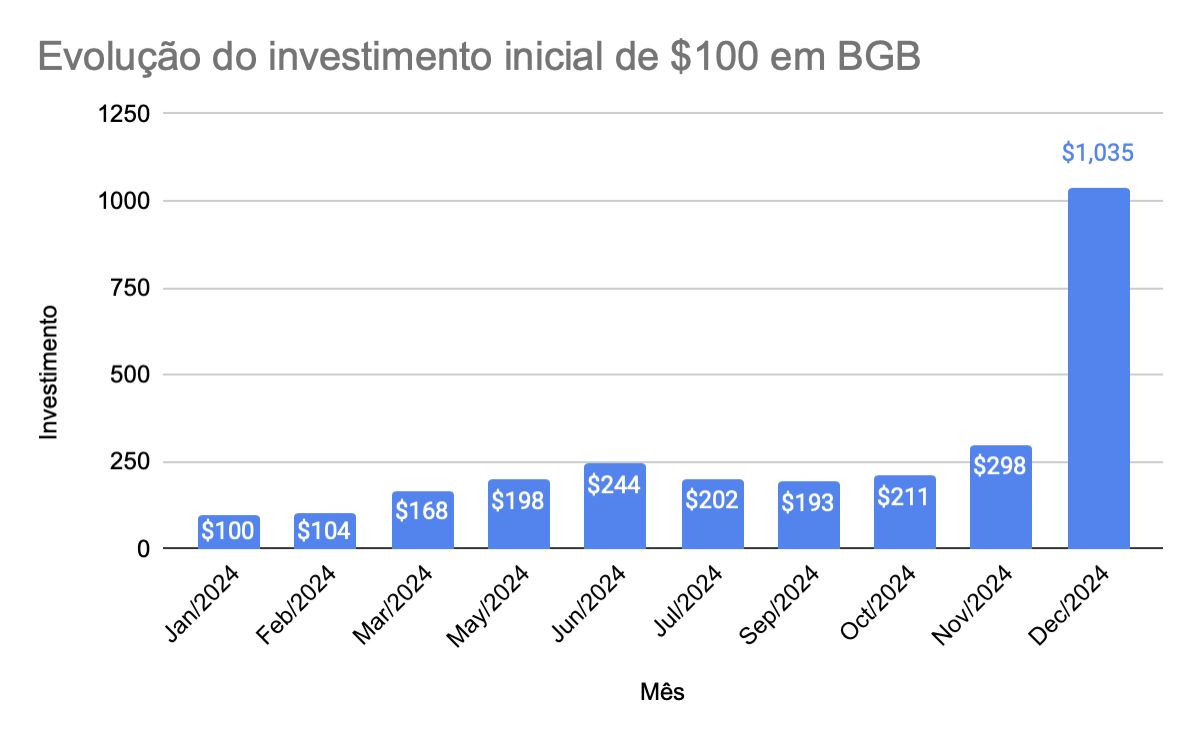 Um exemplo ilustra a impressionante subida do token. O gráfico abaixo mostra uma situação hipotética de um investidor que tenha investido US$100 em 1º de janeiro de 2024. Esse investidor teria, no último dia do ano, US$1.035. Se tivesse vendido o token em 27 de dezembro, data de seu recorde histórico, teria obtido US$1.487.