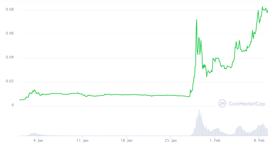 Nas últimas 24 horas o preço da criptomoeda cresceu mais 8%, estabelecendo uma nova máxima histórica de US$ 0.084 nesta segunda-feira (8).