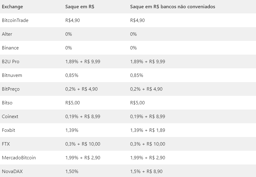Já outras como B2U Pro, Coinext e FTX, cobram uma taxa fixa que se aproxima de R$ 10, mais um percentual sobre o valor do saque entre 0,19% e 1,89%. A fintech Alter era a única até então que oferecia saque gratuito junto com a Binance, mas a instituição opera mais como banco digital do que como corretora.