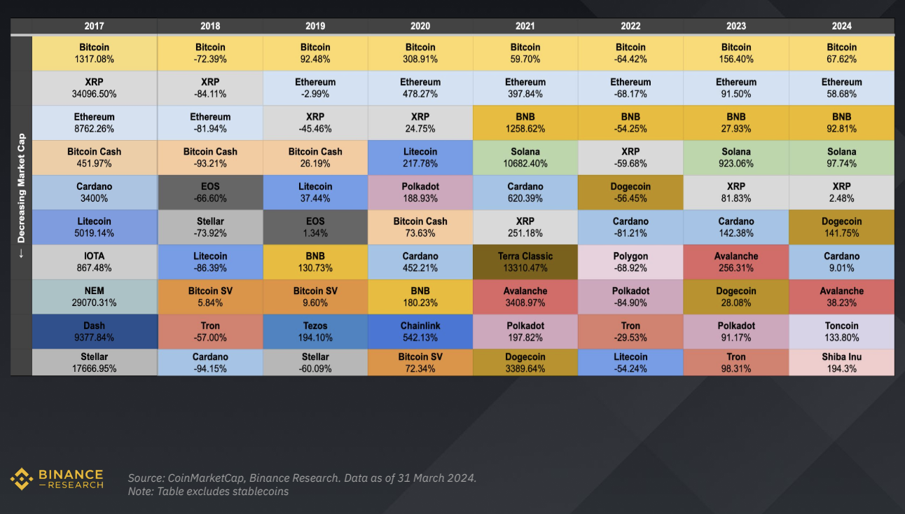 Um relatório da Market Pulse da Binance Research destaca a evolução e as tendências do mercado cripto no primeiro trimestre de 2024.