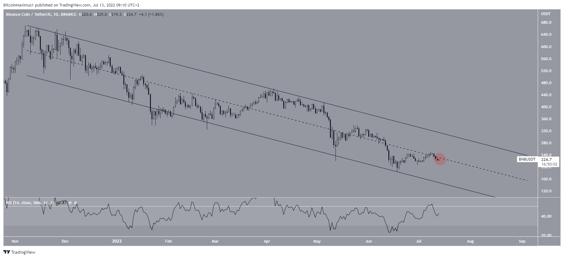 A Binance Coin (BNB) está no meio de um canal paralelo que está em vigor desde novembro de 2021. Se o preço recupera a linha do meio do canal ou for rejeitado por ela, pode determinar a direção da tendência futura.