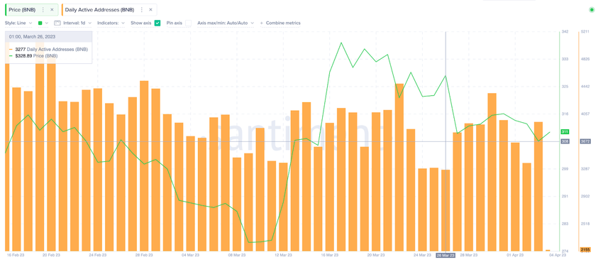 Sponsored SponsoredNas últimas semanas, a BNB Chain experimentou uma divergência positiva entre preço e endereços ativos diariamente, de acordo com Santiment. O gráfico abaixo mostra que, embora o preço tenha caído 7% entre 26 de março e 3 de abril, a tração diária na rede se recuperou de 3.277 endereços para 3.947.