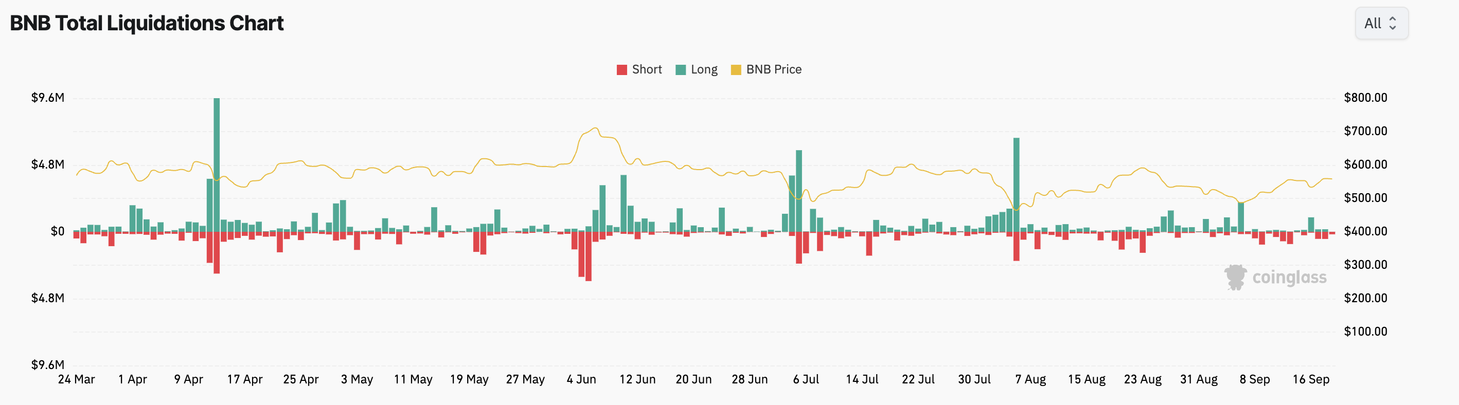 Quando o preço do BNB disparou além de um certo nível, os traders com posições curtas foram compelidos a sair para minimizar perdas. Desde 16 de setembro, as liquidações curtas de BNB totalizaram US$ 1,3 milhões, segundo a Coinglass.