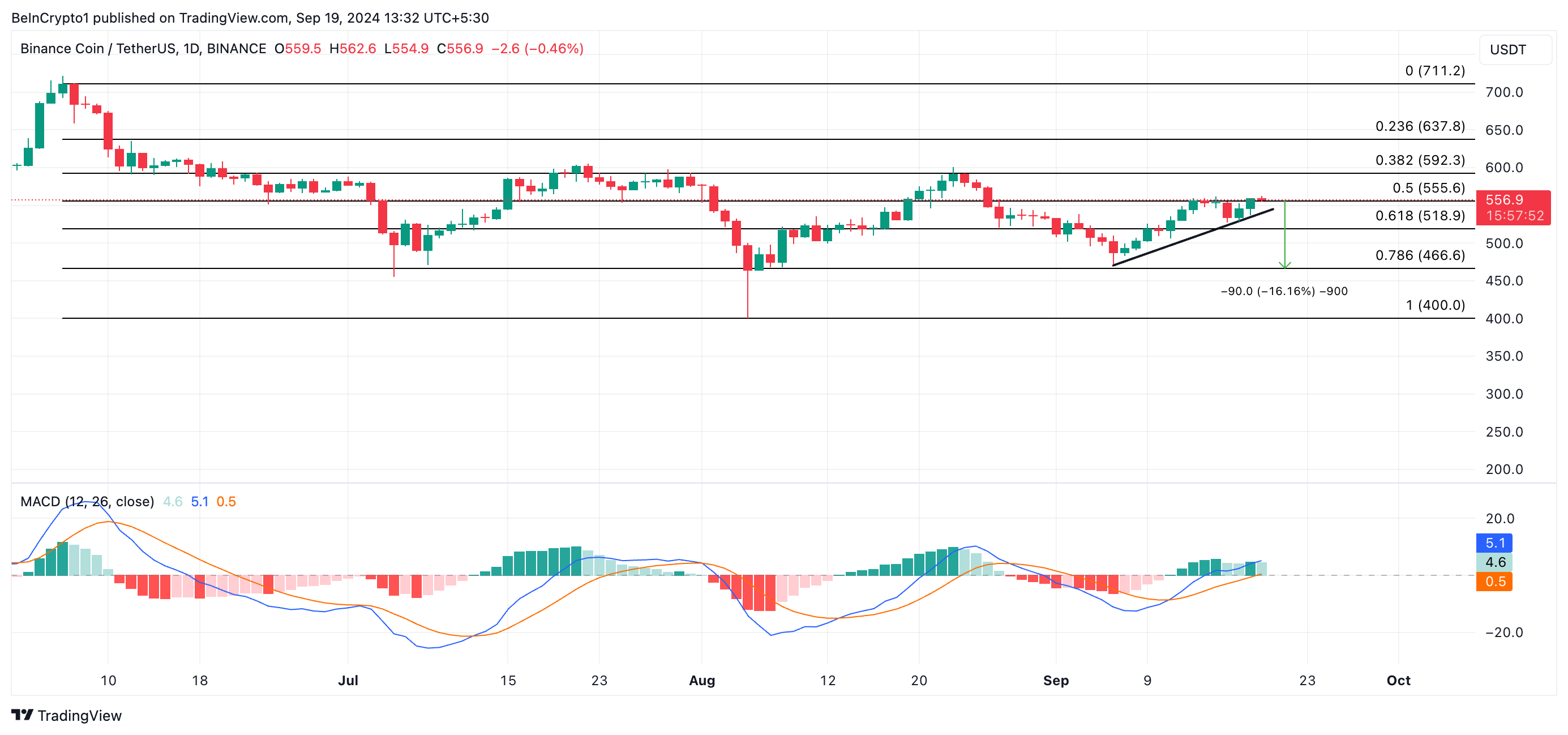 Se a pressão de compra continuar, o BNB poderá avançar em direção ao nível de resistência de US$ 592,30. Uma quebra acima deste nível colocaria a moeda no caminho para alcançar US$ 637,80.
