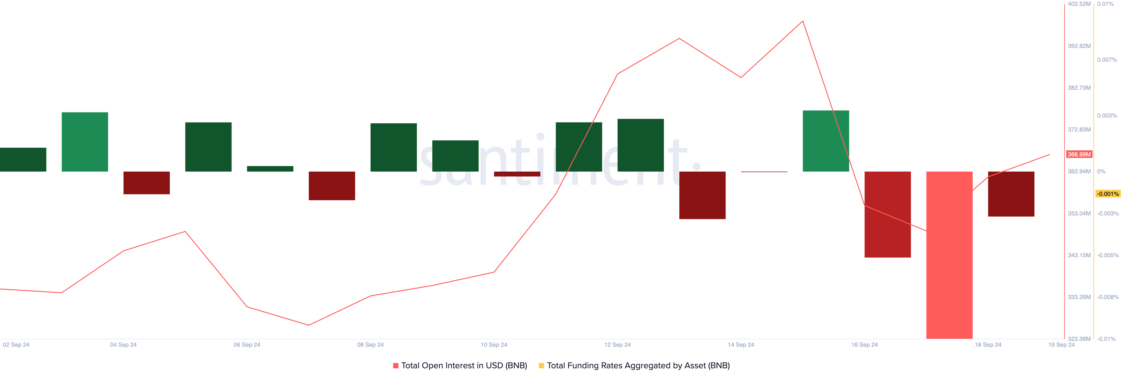 De acordo com a Santiment, a taxa de financiamento do BNB — que mantém os contratos futuros alinhados com o preço à vista — está negativa nos últimos três dias, atualmente em -0,001%.