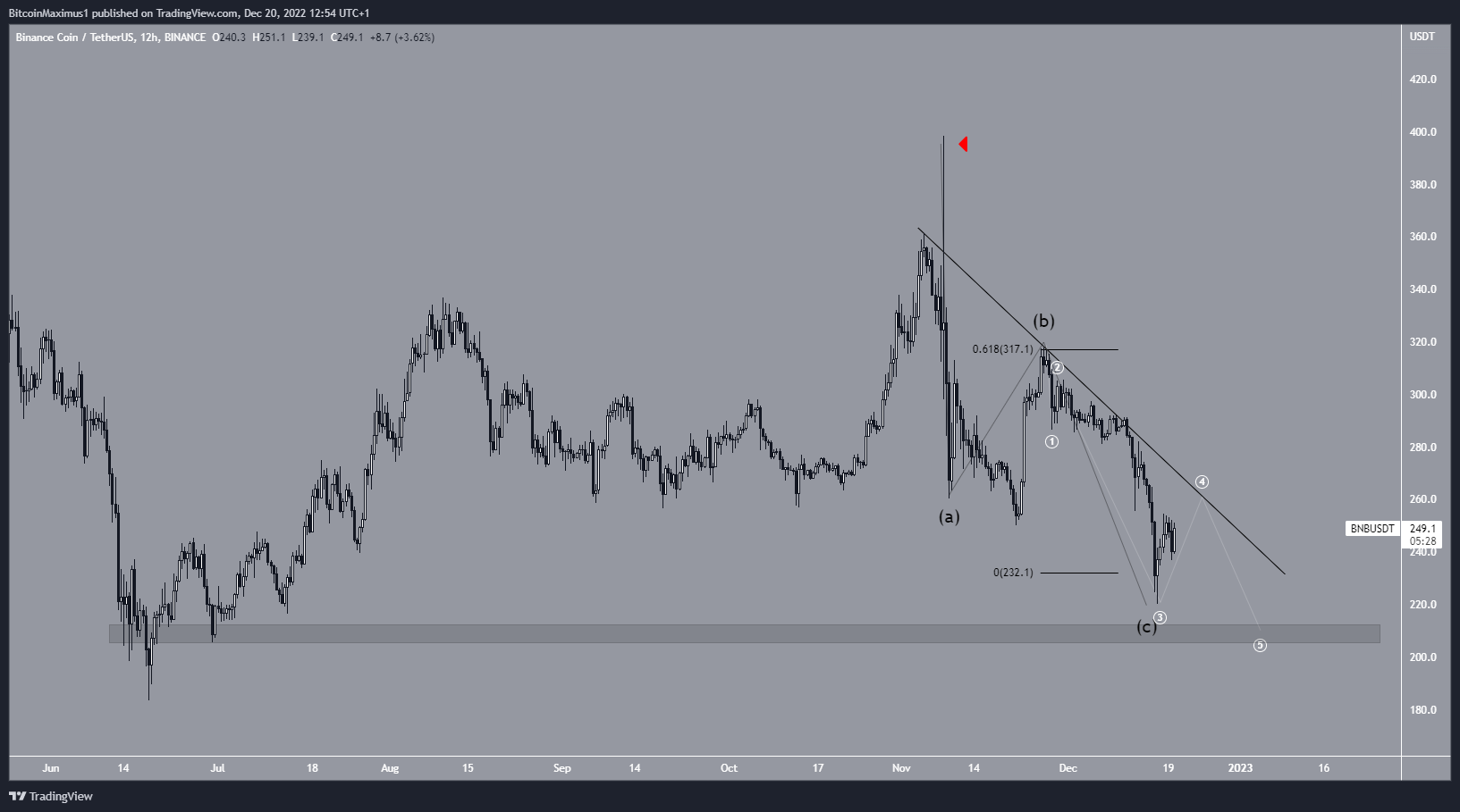 Embora o gráfico diário não ofereça uma direção decisiva para a tendência, a contagem de ondas sugere que o preço do BNB enfrentará mais quedas.