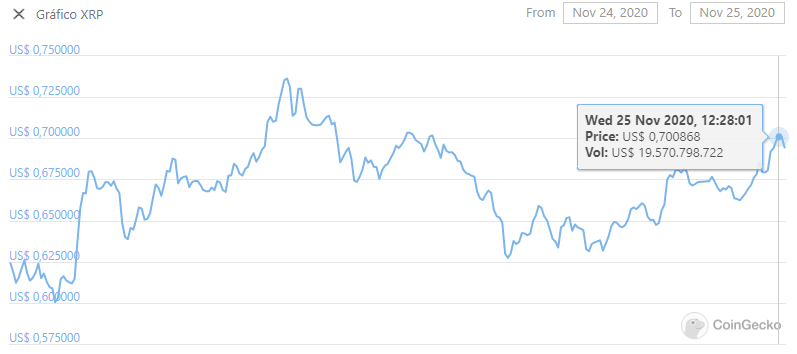 A moeda também já parece refletir o anúncio da Binance. Minutos após a confirmação, a moeda da Ripple voltou a subir para o patamar de US$ 0,70. Até o momento, o ativo acumula alta de 12,5% nas últimas 24 horas.