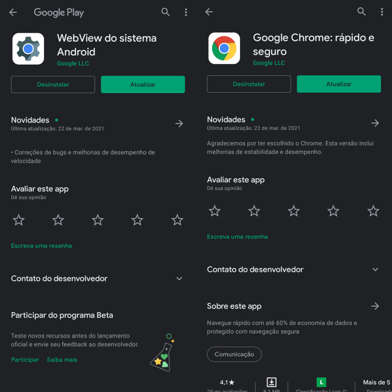 A atualização dos dois componentes do Android pode não ser disponibilizada para todos imediatamente. Nesses casos, é possível acessar a Google Play e desinstalar atualizações anteriores para restaurar o funcionamento dos aplicativos no celular.