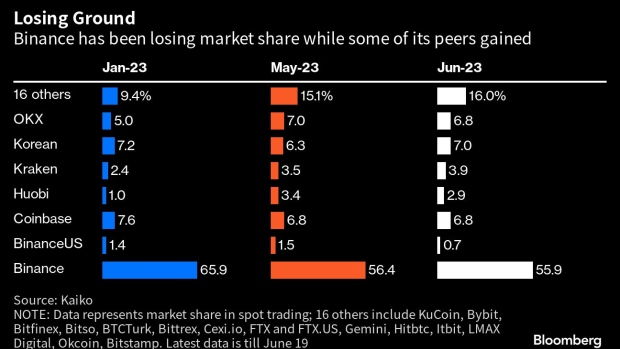 De acordo com a Bloomberg, a participação de mercado da Binance caiu de 65,9% em janeiro para 56,4% em maio e finalmente para 55,9% em junho. Já a empresa de pesquisa de dados Kaiko diz que a participação de mercado da Binance está quase perto de sua mínima. Em agosto de 2022, atingiu uma baixa de 53,7%.